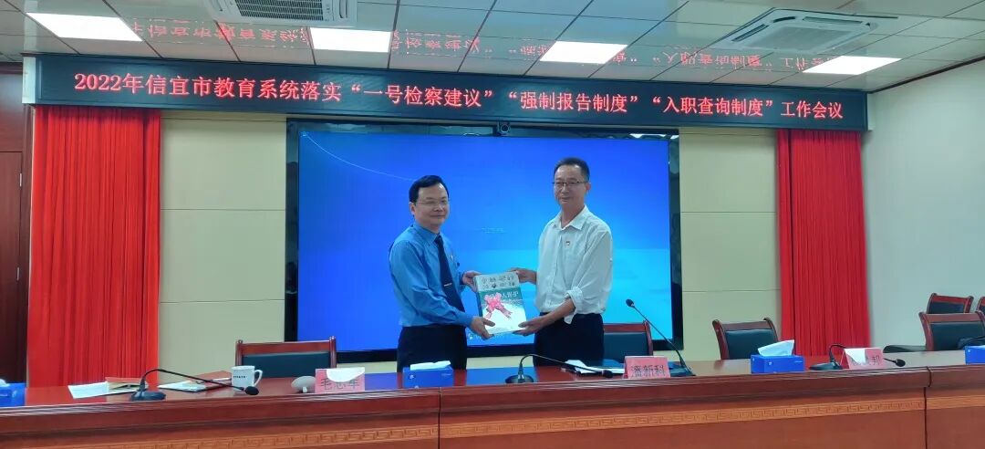 杨良邦副检察长代表检察院向教育局赠送《未成年人保护法律全书》和强制报告制度海报。