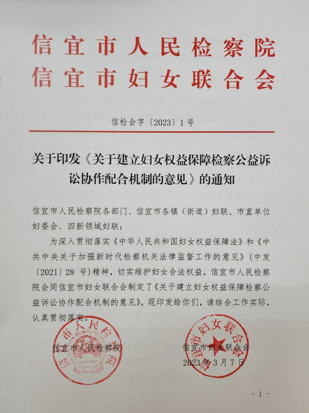 为深入贯彻落实《中华人民共和国妇女权益保障法》和《中共中央关于加强新时代检察机关法律监督工作的意见》有关规定,切实维护妇女合法权益,3月7日上午,信宜市检察院与信宜市妇联制定并会签了《关于建立妇女权益保障检察公益诉讼协作配合机制的意见》(以下简称《意见》),通过建立沟通与协调机制、线索移送与反馈机制、办案协作机制、宣传与培训机制等四项工作机制,进一步强化了信宜市检察院与信宜市妇联在妇女权益保障领域的协作与配合。