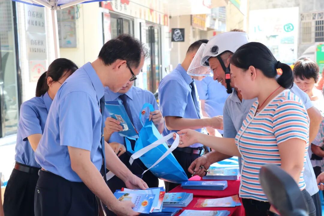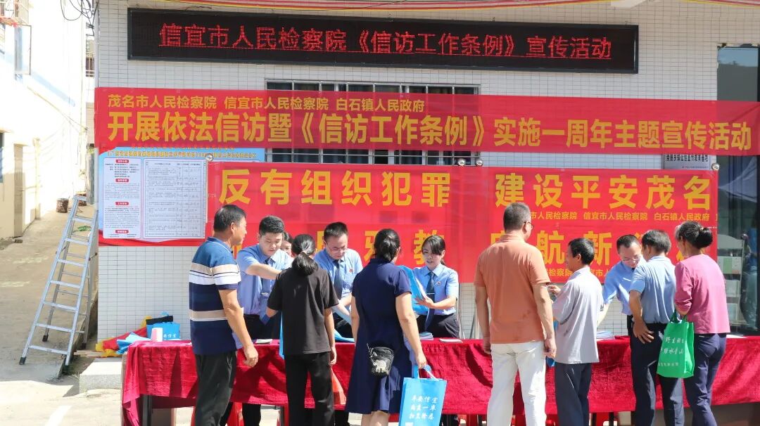 为进一步加强平安建设宣传,深入营造平安和谐的社会环境,9月21日,茂名市人民检察院、信宜市人民检察院联合白石镇政府在白石镇开展反有组织犯罪、反邪教、禁毒、“两度一率”、《信访工作条例》等宣传活动。