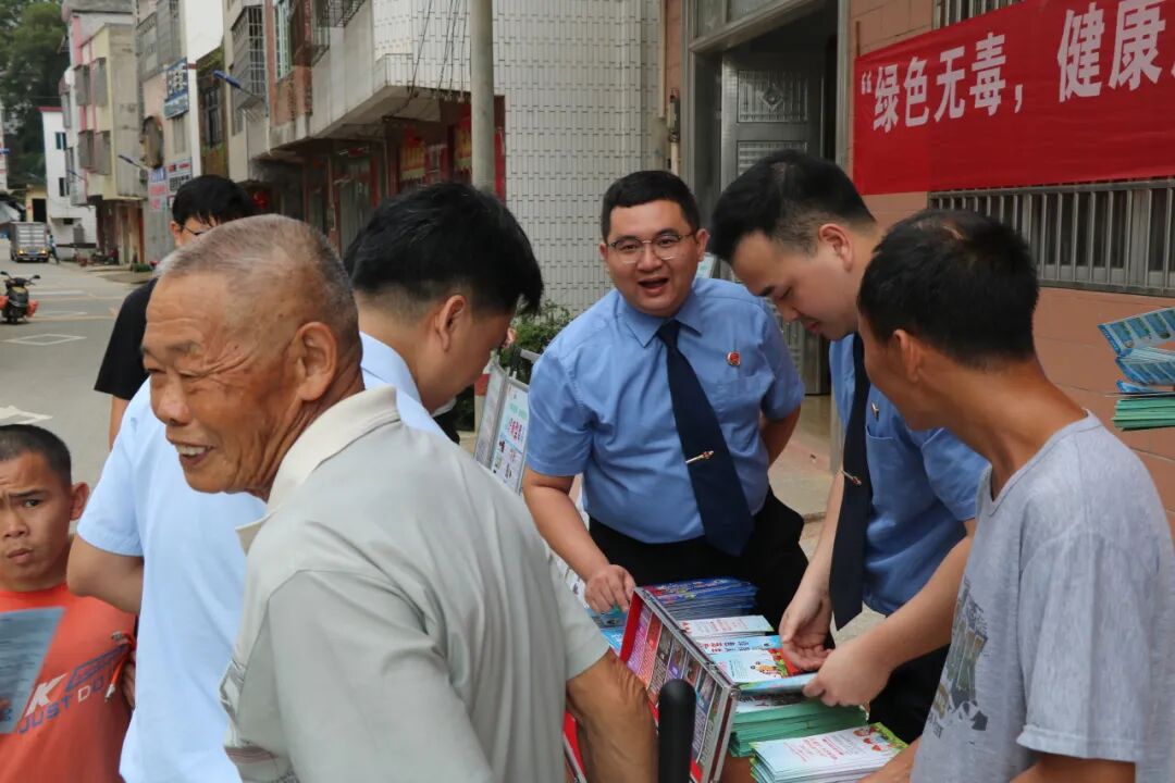 下午3:00,我院干警联合共青团信宜市委员会、池洞镇大坡村工作人员,通过在大坡村村委会门前悬挂禁毒横幅、发放禁毒宣传册,向沿街商铺、居民户主派发禁毒宣传资料、展示仿真毒品模型,广泛宣传毒品的种类、危害、新型毒品预防办法、禁毒相关法律法规等知识,让每户居民都能了解到毒品对个人、家庭、社会造成的严重危害性,自觉提高自我保护意识和能力,并号召群众动员家人朋友共同参与到禁毒中来,一旦发现涉毒违法行为及时向公安机关举报。