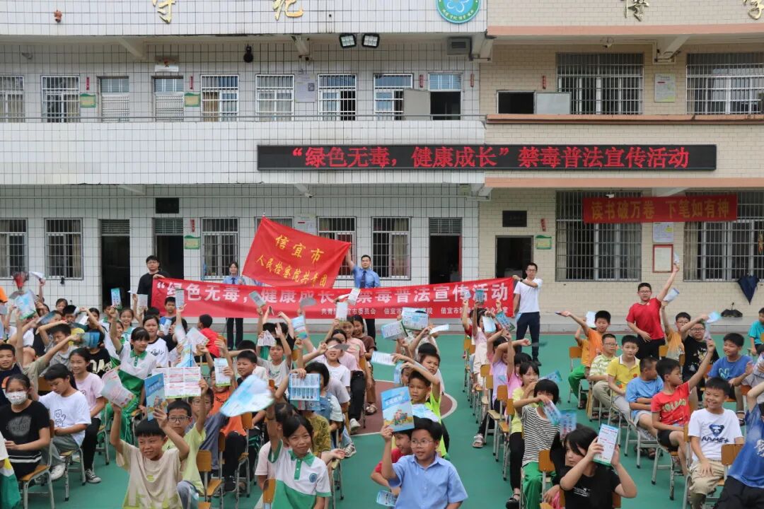 上午9:00,我院联合共青团信宜市委员会等单位到英地坡小学开展“绿色无毒,健康成长”禁毒普法宣传活动。我院“信·云开”法治宣讲团成员向同学们讲解了“6.26”国际禁毒日的由来,并从“什么是毒品”“毒品的种类”“如何防范和远离毒品”等方面给同学们普及了依托咪酯等常见毒品防范知识,并通过真实案件强调毒品的危害,告诫同学们千万不要因为一时好奇而吸食毒品,避免酿成悲剧。